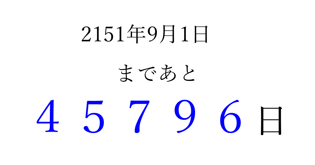 2151年9月1日(水)まで あと 99999 日です 追加すると、トップページからすぐ選べるようになります ※2026/04/13現在の結果です。 最新の状態に更新する ↓シェアして、タイムライン上にカウントダウンを表示しよう!↓ 📤 この結果を共有する Tweet シェア Threads Bluesky 別の日付でカウントダウン 2151年9月のカレンダー このページをブックマークに追加すると、いつでもカウントダウンを確認できます。 (PC: Ctrl+D / Mac: ⌘+D) hitome-notes.comでは以下のページも運営しています。 指定日と期間から日付を計算 | ガチャ確率計算・シミュレーション | プライバシー・ポリシー 運営者:Avocado