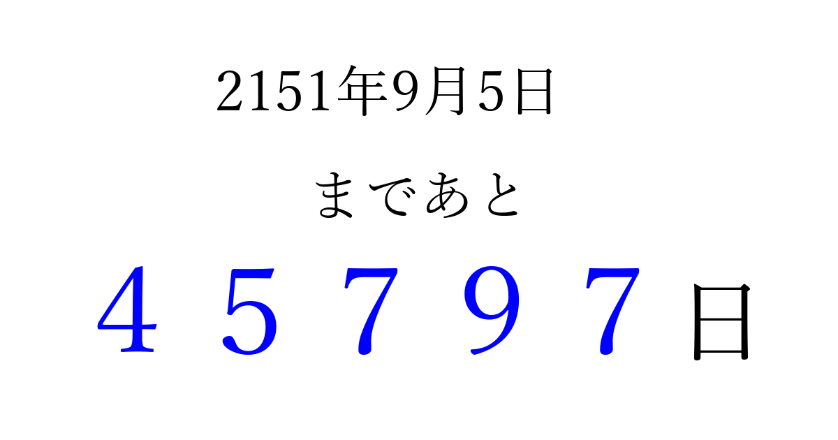 2151年9月5日(日)まで あと 99999 日です 追加すると、トップページからすぐ選べるようになります ※2026/04/16現在の結果です。 最新の状態に更新する ↓シェアして、タイムライン上にカウントダウンを表示しよう!↓ 📤 この結果を共有する Tweet シェア Threads Bluesky 別の日付でカウントダウン 2151年9月のカレンダー このページをブックマークに追加すると、いつでもカウントダウンを確認できます。 (PC: Ctrl+D / Mac: ⌘+D) hitome-notes.comでは以下のページも運営しています。 指定日と期間から日付を計算 | ガチャ確率計算・シミュレーション | プライバシー・ポリシー 運営者:Avocado
