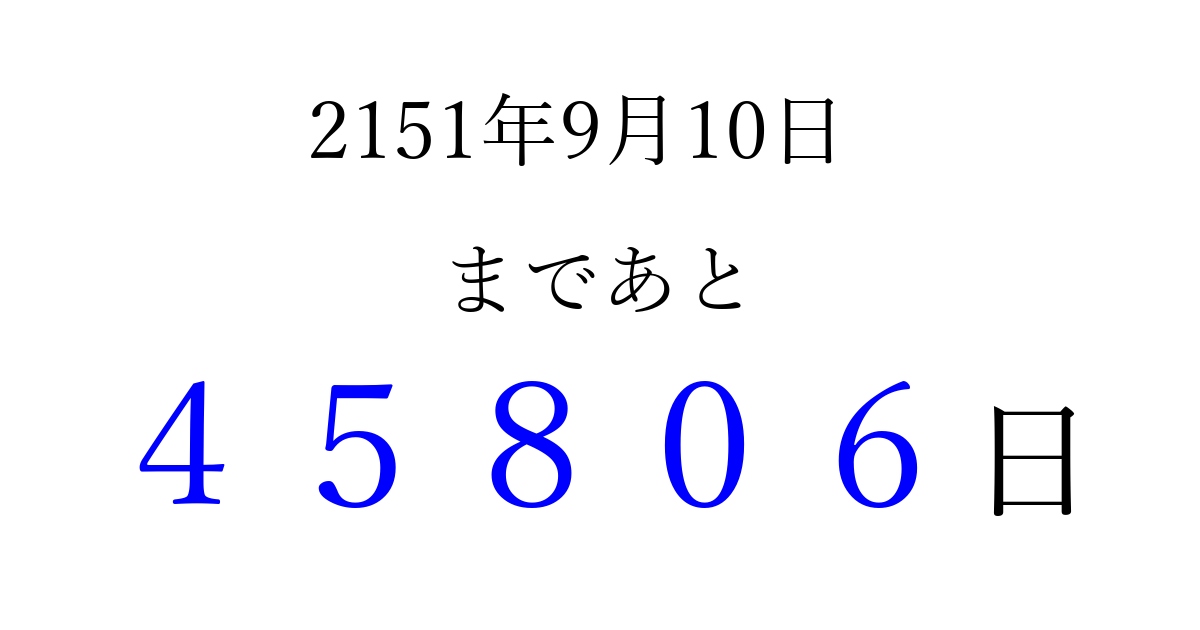2151年9月10日(金)まで あと 99999 日です 追加すると、トップページからすぐ選べるようになります ※2026/04/12現在の結果です。 最新の状態に更新する ↓シェアして、タイムライン上にカウントダウンを表示しよう!↓ 📤 この結果を共有する Tweet シェア Threads Bluesky 別の日付でカウントダウン 2151年9月のカレンダー このページをブックマークに追加すると、いつでもカウントダウンを確認できます。 (PC: Ctrl+D / Mac: ⌘+D) hitome-notes.comでは以下のページも運営しています。 指定日と期間から日付を計算 | ガチャ確率計算・シミュレーション | プライバシー・ポリシー 運営者:Avocado