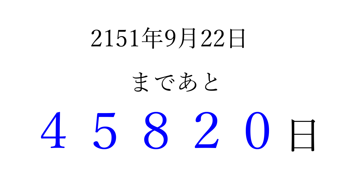 2151年9月22日(水)まで あと 99999 日です 追加すると、トップページからすぐ選べるようになります ※2026/04/10現在の結果です。 最新の状態に更新する ↓シェアして、タイムライン上にカウントダウンを表示しよう!↓ 📤 この結果を共有する Tweet シェア Threads Bluesky 別の日付でカウントダウン 2151年9月のカレンダー このページをブックマークに追加すると、いつでもカウントダウンを確認できます。 (PC: Ctrl+D / Mac: ⌘+D) hitome-notes.comでは以下のページも運営しています。 指定日と期間から日付を計算 | ガチャ確率計算・シミュレーション | プライバシー・ポリシー 運営者:Avocado