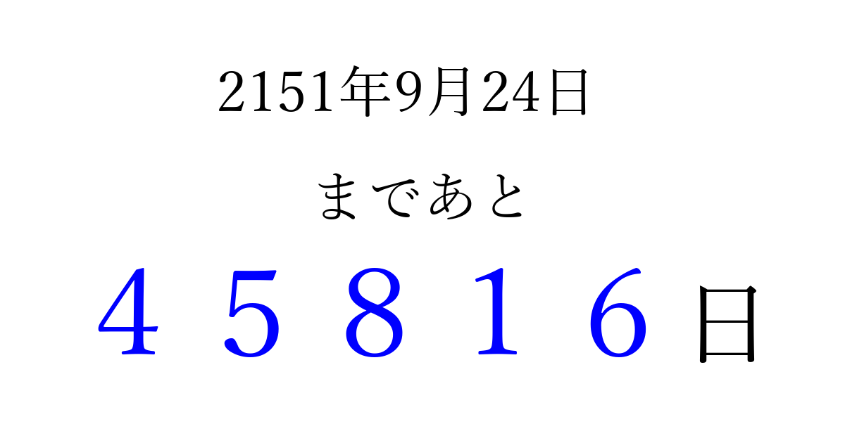2151年9月24日(金)まで あと 99999 日です 追加すると、トップページからすぐ選べるようになります ※2026/04/16現在の結果です。 最新の状態に更新する ↓シェアして、タイムライン上にカウントダウンを表示しよう!↓ 📤 この結果を共有する Tweet シェア Threads Bluesky 別の日付でカウントダウン 2151年9月のカレンダー このページをブックマークに追加すると、いつでもカウントダウンを確認できます。 (PC: Ctrl+D / Mac: ⌘+D) hitome-notes.comでは以下のページも運営しています。 指定日と期間から日付を計算 | ガチャ確率計算・シミュレーション | プライバシー・ポリシー 運営者:Avocado