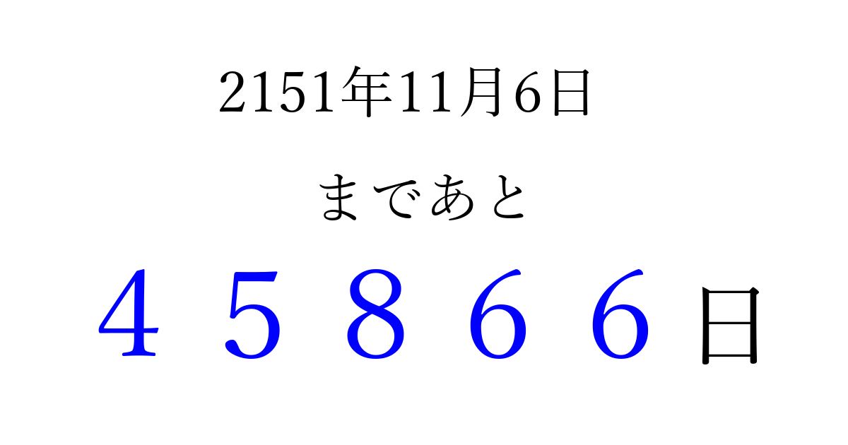 2151年11月6日(土)まで あと 99999 日です 追加すると、トップページからすぐ選べるようになります ※2026/04/09現在の結果です。 最新の状態に更新する ↓シェアして、タイムライン上にカウントダウンを表示しよう!↓ 📤 この結果を共有する Tweet シェア Threads Bluesky 別の日付でカウントダウン 2151年11月のカレンダー このページをブックマークに追加すると、いつでもカウントダウンを確認できます。 (PC: Ctrl+D / Mac: ⌘+D) hitome-notes.comでは以下のページも運営しています。 指定日と期間から日付を計算 | ガチャ確率計算・シミュレーション | プライバシー・ポリシー 運営者:Avocado