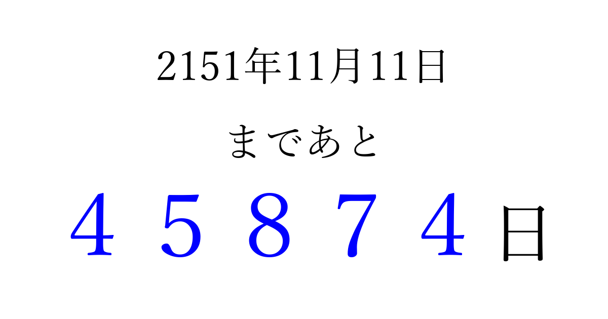 2151年11月11日(木)まで あと 99999 日です 追加すると、トップページからすぐ選べるようになります ※2026/04/06現在の結果です。 最新の状態に更新する ↓シェアして、タイムライン上にカウントダウンを表示しよう!↓ 📤 この結果を共有する Tweet シェア Threads Bluesky 別の日付でカウントダウン 2151年11月のカレンダー このページをブックマークに追加すると、いつでもカウントダウンを確認できます。 (PC: Ctrl+D / Mac: ⌘+D) hitome-notes.comでは以下のページも運営しています。 指定日と期間から日付を計算 | ガチャ確率計算・シミュレーション | プライバシー・ポリシー 運営者:Avocado