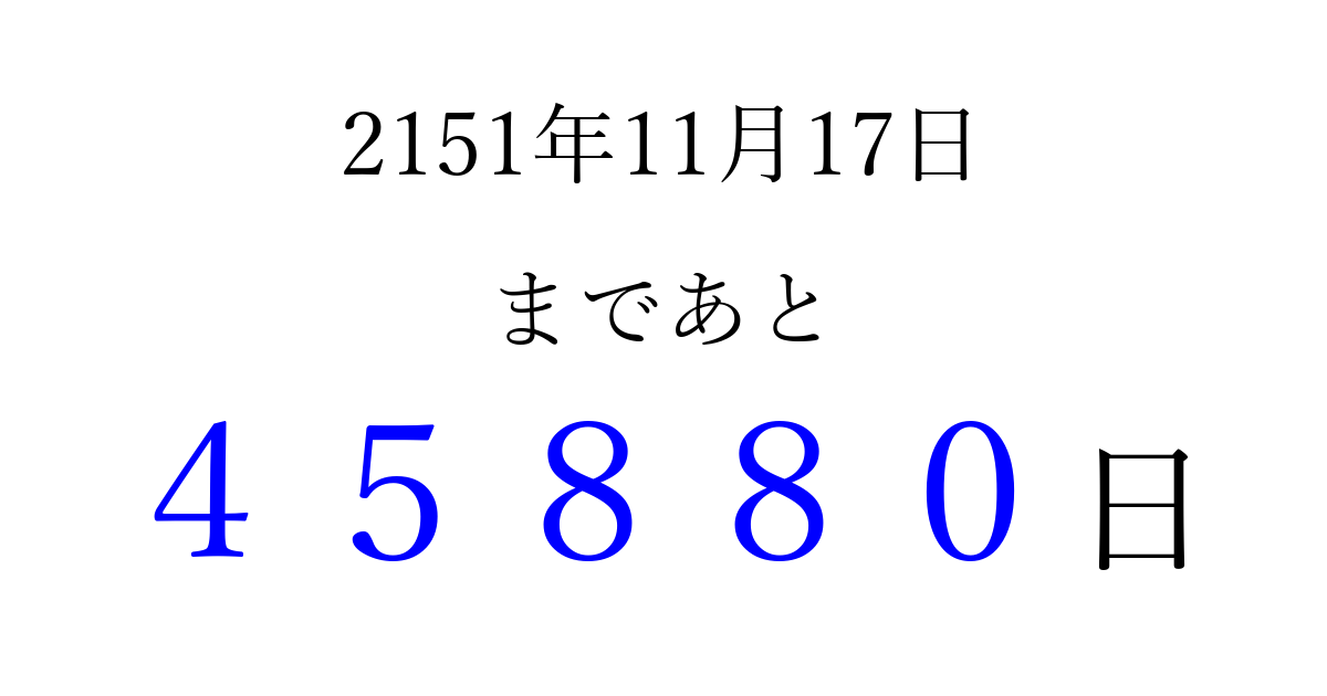 2151年11月17日(水)まで あと 99999 日です 追加すると、トップページからすぐ選べるようになります ※2026/04/06現在の結果です。 最新の状態に更新する ↓シェアして、タイムライン上にカウントダウンを表示しよう!↓ 📤 この結果を共有する Tweet シェア Threads Bluesky 別の日付でカウントダウン 2151年11月のカレンダー このページをブックマークに追加すると、いつでもカウントダウンを確認できます。 (PC: Ctrl+D / Mac: ⌘+D) hitome-notes.comでは以下のページも運営しています。 指定日と期間から日付を計算 | ガチャ確率計算・シミュレーション | プライバシー・ポリシー 運営者:Avocado