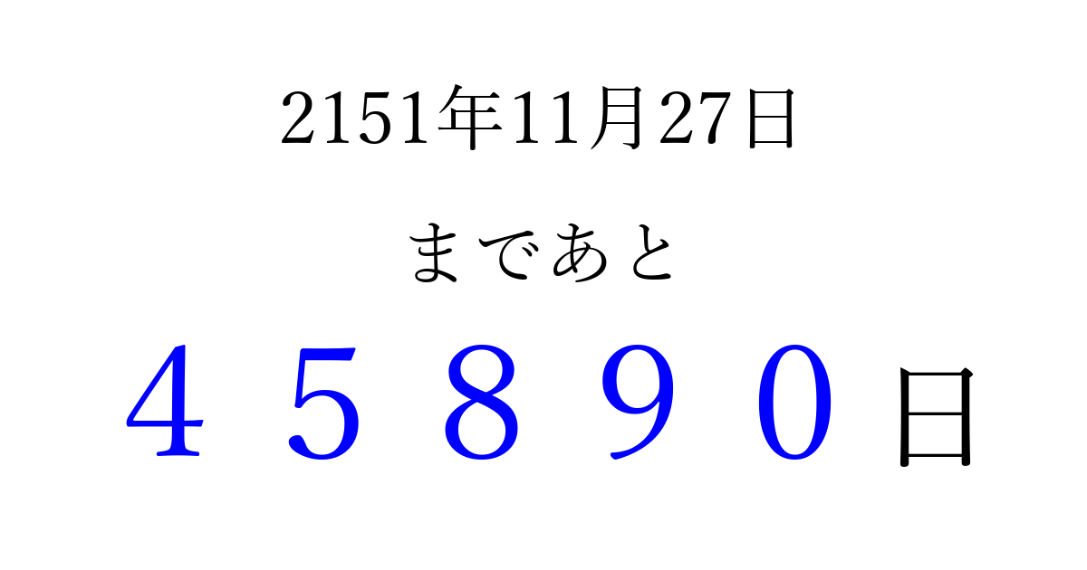 2151年11月27日(土)まで あと 99999 日です 追加すると、トップページからすぐ選べるようになります ※2026/04/06現在の結果です。 最新の状態に更新する ↓シェアして、タイムライン上にカウントダウンを表示しよう!↓ 📤 この結果を共有する Tweet シェア Threads Bluesky 別の日付でカウントダウン 2151年11月のカレンダー このページをブックマークに追加すると、いつでもカウントダウンを確認できます。 (PC: Ctrl+D / Mac: ⌘+D) hitome-notes.comでは以下のページも運営しています。 指定日と期間から日付を計算 | ガチャ確率計算・シミュレーション | プライバシー・ポリシー 運営者:Avocado