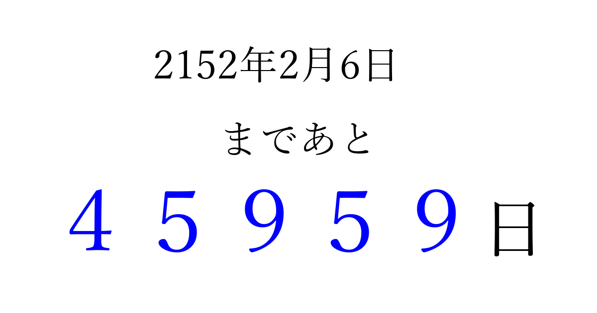 2152年2月6日(日)まで あと 99999 日です 追加すると、トップページからすぐ選べるようになります ※2026/04/08現在の結果です。 最新の状態に更新する ↓シェアして、タイムライン上にカウントダウンを表示しよう!↓ 📤 この結果を共有する Tweet シェア Threads Bluesky 別の日付でカウントダウン 2152年2月のカレンダー このページをブックマークに追加すると、いつでもカウントダウンを確認できます。 (PC: Ctrl+D / Mac: ⌘+D) hitome-notes.comでは以下のページも運営しています。 指定日と期間から日付を計算 | ガチャ確率計算・シミュレーション | プライバシー・ポリシー 運営者:Avocado