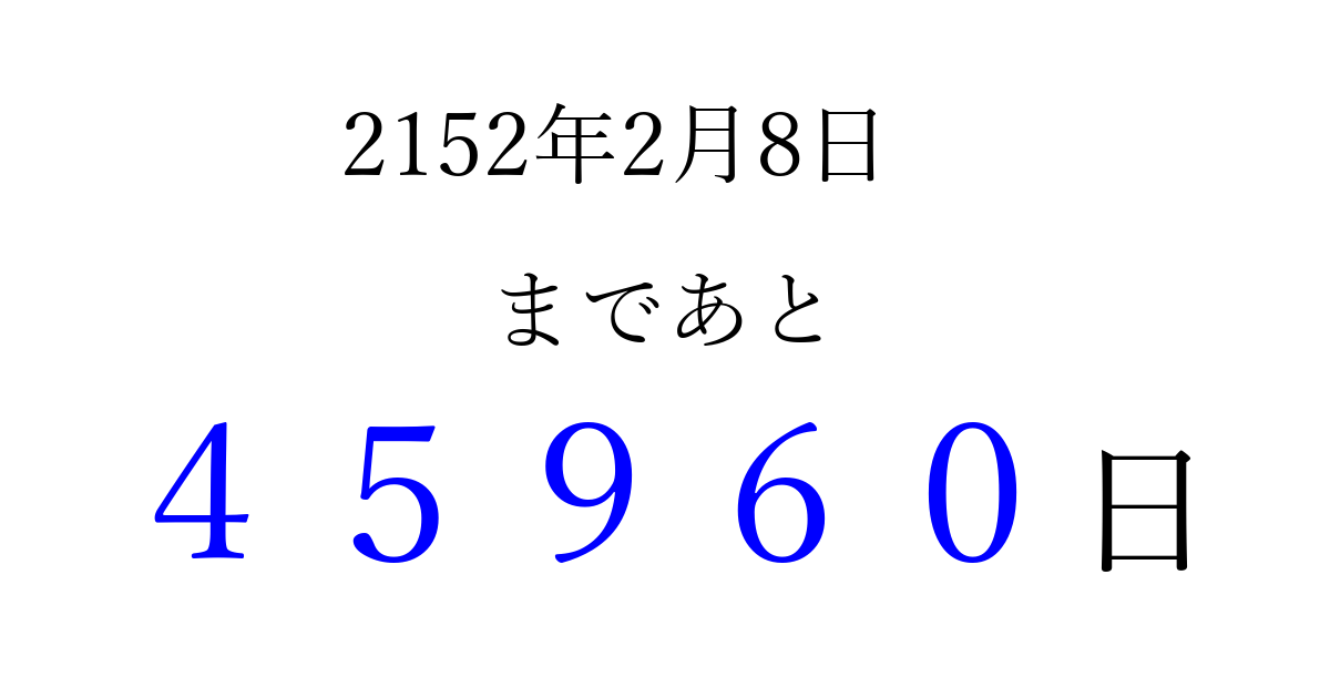 2152年2月8日(火)まで あと 99999 日です 追加すると、トップページからすぐ選べるようになります ※2026/04/09現在の結果です。 最新の状態に更新する ↓シェアして、タイムライン上にカウントダウンを表示しよう!↓ 📤 この結果を共有する Tweet シェア Threads Bluesky 別の日付でカウントダウン 2152年2月のカレンダー このページをブックマークに追加すると、いつでもカウントダウンを確認できます。 (PC: Ctrl+D / Mac: ⌘+D) hitome-notes.comでは以下のページも運営しています。 指定日と期間から日付を計算 | ガチャ確率計算・シミュレーション | プライバシー・ポリシー 運営者:Avocado
