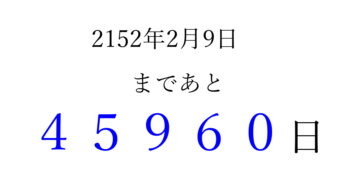 2152年2月9日(水)まで あと 99999 日です 追加すると、トップページからすぐ選べるようになります ※2026/04/10現在の結果です。 最新の状態に更新する ↓シェアして、タイムライン上にカウントダウンを表示しよう!↓ 📤 この結果を共有する Tweet シェア Threads Bluesky 別の日付でカウントダウン 2152年2月のカレンダー このページをブックマークに追加すると、いつでもカウントダウンを確認できます。 (PC: Ctrl+D / Mac: ⌘+D) hitome-notes.comでは以下のページも運営しています。 指定日と期間から日付を計算 | ガチャ確率計算・シミュレーション | プライバシー・ポリシー 運営者:Avocado