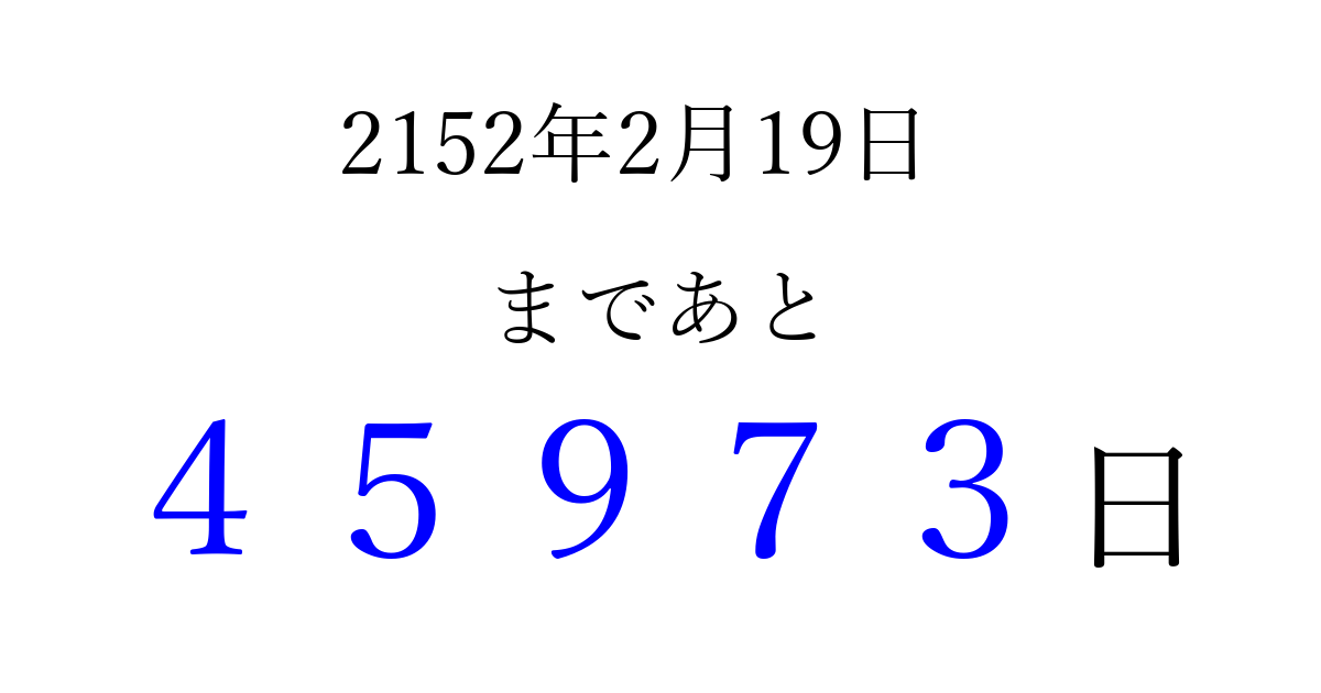2152年2月19日(土)まで あと 99999 日です 追加すると、トップページからすぐ選べるようになります ※2026/04/07現在の結果です。 最新の状態に更新する ↓シェアして、タイムライン上にカウントダウンを表示しよう!↓ 📤 この結果を共有する Tweet シェア Threads Bluesky 別の日付でカウントダウン 2152年2月のカレンダー このページをブックマークに追加すると、いつでもカウントダウンを確認できます。 (PC: Ctrl+D / Mac: ⌘+D) hitome-notes.comでは以下のページも運営しています。 指定日と期間から日付を計算 | ガチャ確率計算・シミュレーション | プライバシー・ポリシー 運営者:Avocado