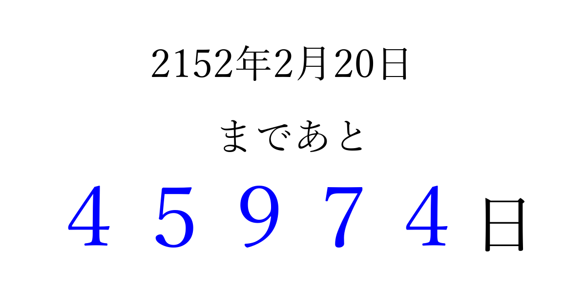 2152年2月20日(日)まで あと 99999 日です 追加すると、トップページからすぐ選べるようになります ※2026/04/07現在の結果です。 最新の状態に更新する ↓シェアして、タイムライン上にカウントダウンを表示しよう!↓ 📤 この結果を共有する Tweet シェア Threads Bluesky 別の日付でカウントダウン 2152年2月のカレンダー このページをブックマークに追加すると、いつでもカウントダウンを確認できます。 (PC: Ctrl+D / Mac: ⌘+D) hitome-notes.comでは以下のページも運営しています。 指定日と期間から日付を計算 | ガチャ確率計算・シミュレーション | プライバシー・ポリシー 運営者:Avocado