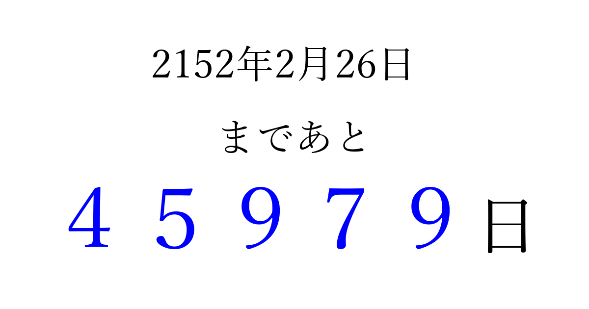 2152年2月26日(土)まで あと 99999 日です 追加すると、トップページからすぐ選べるようになります ※2026/04/08現在の結果です。 最新の状態に更新する ↓シェアして、タイムライン上にカウントダウンを表示しよう!↓ 📤 この結果を共有する Tweet シェア Threads Bluesky 別の日付でカウントダウン 2152年2月のカレンダー このページをブックマークに追加すると、いつでもカウントダウンを確認できます。 (PC: Ctrl+D / Mac: ⌘+D) hitome-notes.comでは以下のページも運営しています。 指定日と期間から日付を計算 | ガチャ確率計算・シミュレーション | プライバシー・ポリシー 運営者:Avocado