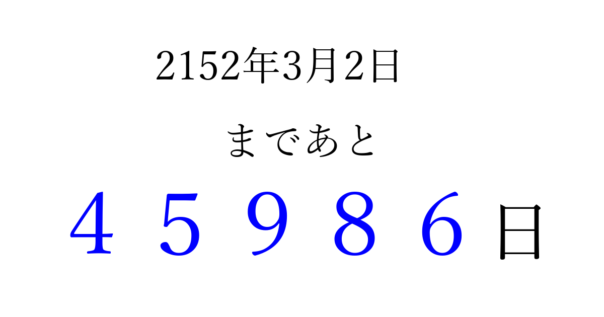 2152年3月2日(木)まで あと 99999 日です 追加すると、トップページからすぐ選べるようになります ※2026/04/06現在の結果です。 最新の状態に更新する ↓シェアして、タイムライン上にカウントダウンを表示しよう!↓ 📤 この結果を共有する Tweet シェア Threads Bluesky 別の日付でカウントダウン 2152年3月のカレンダー このページをブックマークに追加すると、いつでもカウントダウンを確認できます。 (PC: Ctrl+D / Mac: ⌘+D) hitome-notes.comでは以下のページも運営しています。 指定日と期間から日付を計算 | ガチャ確率計算・シミュレーション | プライバシー・ポリシー 運営者:Avocado