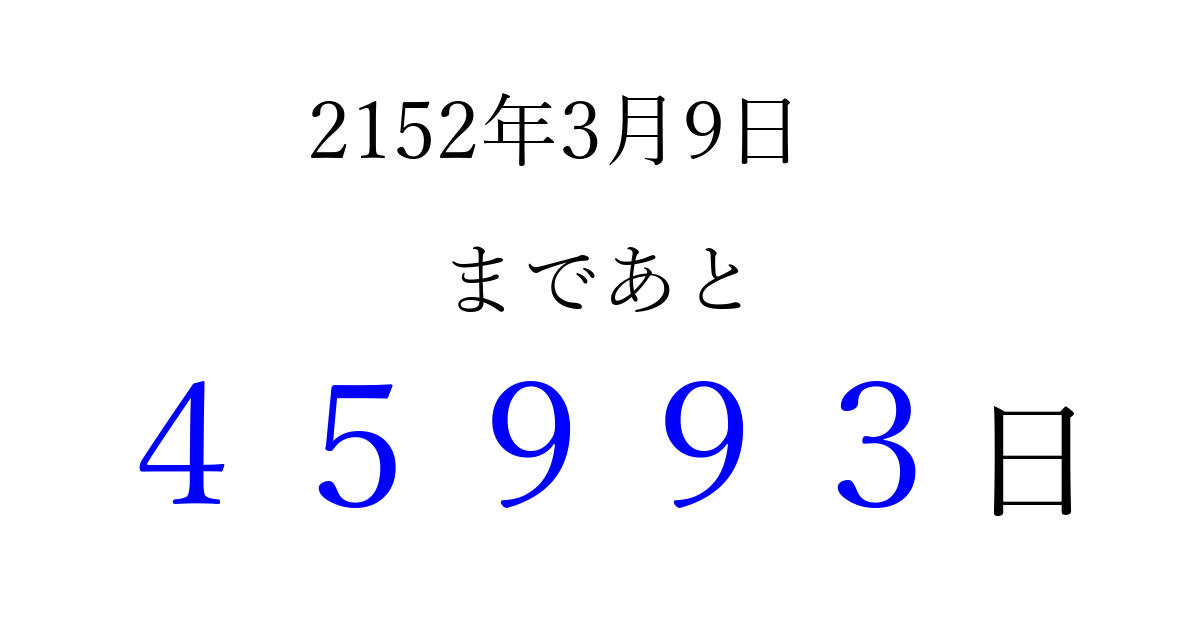 2152年3月9日(木)まで あと 99999 日です 追加すると、トップページからすぐ選べるようになります ※2026/04/06現在の結果です。 最新の状態に更新する ↓シェアして、タイムライン上にカウントダウンを表示しよう!↓ 📤 この結果を共有する Tweet シェア Threads Bluesky 別の日付でカウントダウン 2152年3月のカレンダー このページをブックマークに追加すると、いつでもカウントダウンを確認できます。 (PC: Ctrl+D / Mac: ⌘+D) hitome-notes.comでは以下のページも運営しています。 指定日と期間から日付を計算 | ガチャ確率計算・シミュレーション | プライバシー・ポリシー 運営者:Avocado
