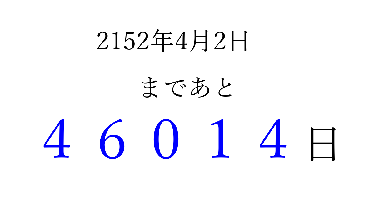 2152年4月2日(日)まで あと 99999 日です 追加すると、トップページからすぐ選べるようになります ※2026/04/09現在の結果です。 最新の状態に更新する ↓シェアして、タイムライン上にカウントダウンを表示しよう!↓ 📤 この結果を共有する Tweet シェア Threads Bluesky 別の日付でカウントダウン 2152年4月のカレンダー このページをブックマークに追加すると、いつでもカウントダウンを確認できます。 (PC: Ctrl+D / Mac: ⌘+D) hitome-notes.comでは以下のページも運営しています。 指定日と期間から日付を計算 | ガチャ確率計算・シミュレーション | プライバシー・ポリシー 運営者:Avocado