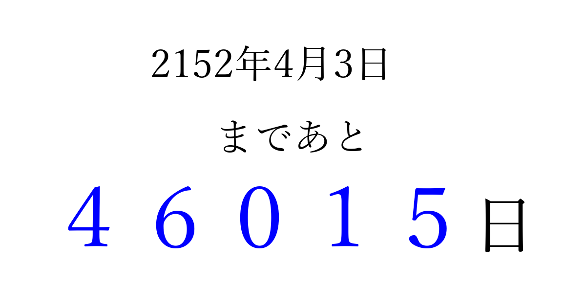 2152年4月3日(月)まで あと 99999 日です 追加すると、トップページからすぐ選べるようになります ※2026/04/09現在の結果です。 最新の状態に更新する ↓シェアして、タイムライン上にカウントダウンを表示しよう!↓ 📤 この結果を共有する Tweet シェア Threads Bluesky 別の日付でカウントダウン 2152年4月のカレンダー このページをブックマークに追加すると、いつでもカウントダウンを確認できます。 (PC: Ctrl+D / Mac: ⌘+D) hitome-notes.comでは以下のページも運営しています。 指定日と期間から日付を計算 | ガチャ確率計算・シミュレーション | プライバシー・ポリシー 運営者:Avocado