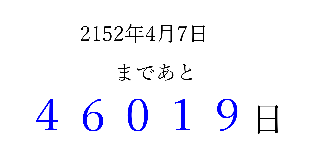 2152年4月7日(金)まで あと 99999 日です 追加すると、トップページからすぐ選べるようになります ※2026/04/09現在の結果です。 最新の状態に更新する ↓シェアして、タイムライン上にカウントダウンを表示しよう!↓ 📤 この結果を共有する Tweet シェア Threads Bluesky 別の日付でカウントダウン 2152年4月のカレンダー このページをブックマークに追加すると、いつでもカウントダウンを確認できます。 (PC: Ctrl+D / Mac: ⌘+D) hitome-notes.comでは以下のページも運営しています。 指定日と期間から日付を計算 | ガチャ確率計算・シミュレーション | プライバシー・ポリシー 運営者:Avocado