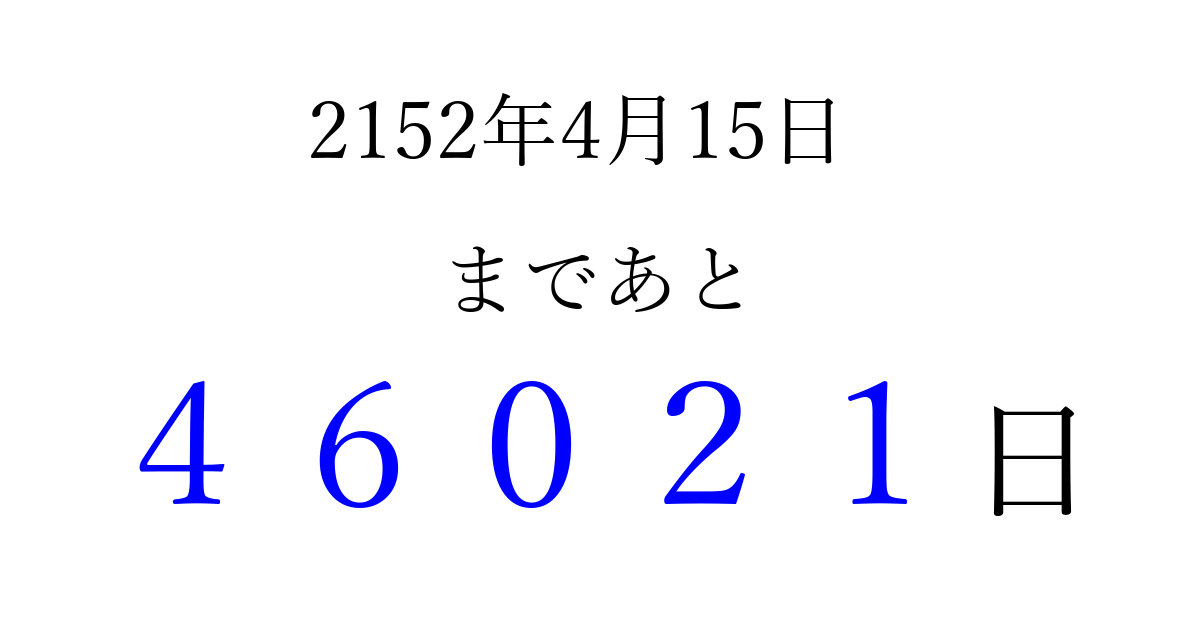 2152年4月15日(土)まで あと 99999 日です 追加すると、トップページからすぐ選べるようになります ※2026/04/15現在の結果です。 最新の状態に更新する ↓シェアして、タイムライン上にカウントダウンを表示しよう!↓ 📤 この結果を共有する Tweet シェア Threads Bluesky 別の日付でカウントダウン 2152年4月のカレンダー このページをブックマークに追加すると、いつでもカウントダウンを確認できます。 (PC: Ctrl+D / Mac: ⌘+D) hitome-notes.comでは以下のページも運営しています。 指定日と期間から日付を計算 | ガチャ確率計算・シミュレーション | プライバシー・ポリシー 運営者:Avocado