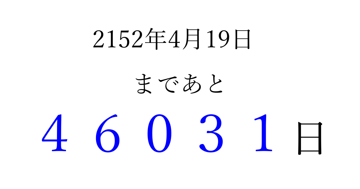 2152年4月19日(水)まで あと 99999 日です 追加すると、トップページからすぐ選べるようになります ※2026/04/09現在の結果です。 最新の状態に更新する ↓シェアして、タイムライン上にカウントダウンを表示しよう!↓ 📤 この結果を共有する Tweet シェア Threads Bluesky 別の日付でカウントダウン 2152年4月のカレンダー このページをブックマークに追加すると、いつでもカウントダウンを確認できます。 (PC: Ctrl+D / Mac: ⌘+D) hitome-notes.comでは以下のページも運営しています。 指定日と期間から日付を計算 | ガチャ確率計算・シミュレーション | プライバシー・ポリシー 運営者:Avocado