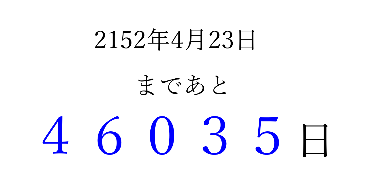 2152年4月23日(日)まで あと 99999 日です 追加すると、トップページからすぐ選べるようになります ※2026/04/09現在の結果です。 最新の状態に更新する ↓シェアして、タイムライン上にカウントダウンを表示しよう!↓ 📤 この結果を共有する Tweet シェア Threads Bluesky 別の日付でカウントダウン 2152年4月のカレンダー このページをブックマークに追加すると、いつでもカウントダウンを確認できます。 (PC: Ctrl+D / Mac: ⌘+D) hitome-notes.comでは以下のページも運営しています。 指定日と期間から日付を計算 | ガチャ確率計算・シミュレーション | プライバシー・ポリシー 運営者:Avocado