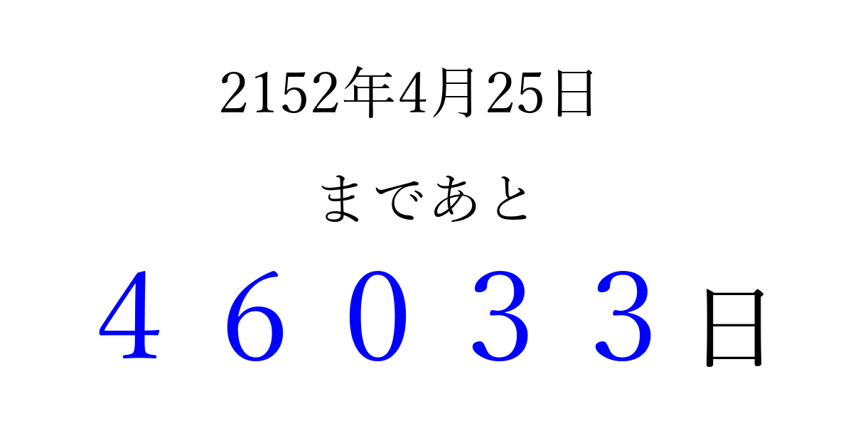 2152年4月25日(火)まで あと 99999 日です 追加すると、トップページからすぐ選べるようになります ※2026/04/13現在の結果です。 最新の状態に更新する ↓シェアして、タイムライン上にカウントダウンを表示しよう!↓ 📤 この結果を共有する Tweet シェア Threads Bluesky 別の日付でカウントダウン 2152年4月のカレンダー このページをブックマークに追加すると、いつでもカウントダウンを確認できます。 (PC: Ctrl+D / Mac: ⌘+D) hitome-notes.comでは以下のページも運営しています。 指定日と期間から日付を計算 | ガチャ確率計算・シミュレーション | プライバシー・ポリシー 運営者:Avocado