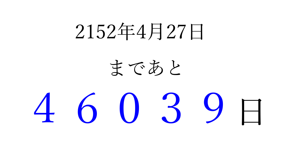 2152年4月27日(木)まで あと 99999 日です 追加すると、トップページからすぐ選べるようになります ※2026/04/09現在の結果です。 最新の状態に更新する ↓シェアして、タイムライン上にカウントダウンを表示しよう!↓ 📤 この結果を共有する Tweet シェア Threads Bluesky 別の日付でカウントダウン 2152年4月のカレンダー このページをブックマークに追加すると、いつでもカウントダウンを確認できます。 (PC: Ctrl+D / Mac: ⌘+D) hitome-notes.comでは以下のページも運営しています。 指定日と期間から日付を計算 | ガチャ確率計算・シミュレーション | プライバシー・ポリシー 運営者:Avocado