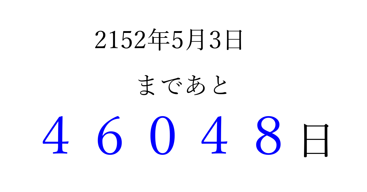 2152年5月3日(水)まで あと 99999 日です 追加すると、トップページからすぐ選べるようになります ※2026/04/06現在の結果です。 最新の状態に更新する ↓シェアして、タイムライン上にカウントダウンを表示しよう!↓ 📤 この結果を共有する Tweet シェア Threads Bluesky 別の日付でカウントダウン 2152年5月のカレンダー このページをブックマークに追加すると、いつでもカウントダウンを確認できます。 (PC: Ctrl+D / Mac: ⌘+D) hitome-notes.comでは以下のページも運営しています。 指定日と期間から日付を計算 | ガチャ確率計算・シミュレーション | プライバシー・ポリシー 運営者:Avocado