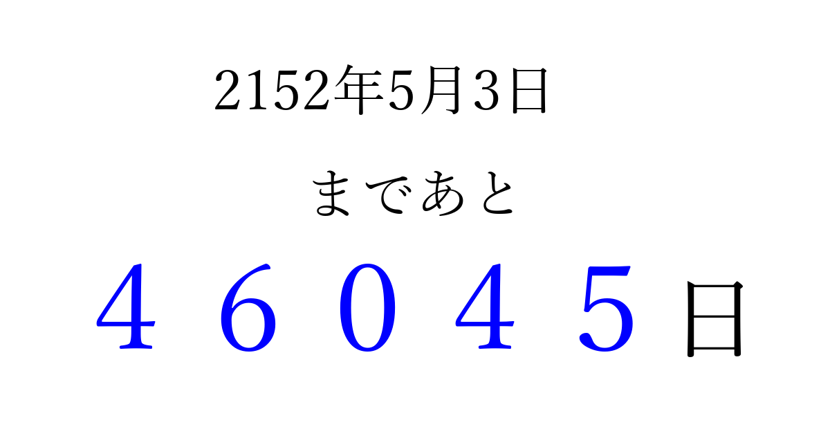 2152年5月3日(水)まで あと 99999 日です 追加すると、トップページからすぐ選べるようになります ※2026/04/09現在の結果です。 最新の状態に更新する ↓シェアして、タイムライン上にカウントダウンを表示しよう!↓ 📤 この結果を共有する Tweet シェア Threads Bluesky 別の日付でカウントダウン 2152年5月のカレンダー このページをブックマークに追加すると、いつでもカウントダウンを確認できます。 (PC: Ctrl+D / Mac: ⌘+D) hitome-notes.comでは以下のページも運営しています。 指定日と期間から日付を計算 | ガチャ確率計算・シミュレーション | プライバシー・ポリシー 運営者:Avocado