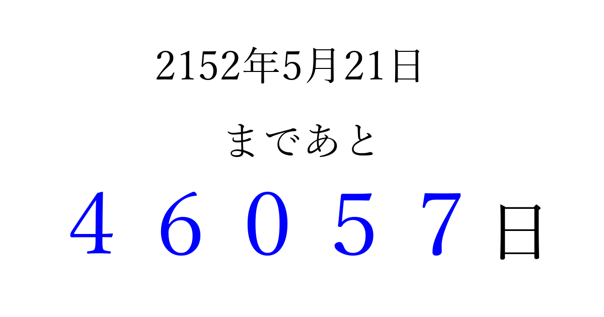 2152年5月21日(日)まで あと 99999 日です 追加すると、トップページからすぐ選べるようになります ※2026/04/15現在の結果です。 最新の状態に更新する ↓シェアして、タイムライン上にカウントダウンを表示しよう!↓ 📤 この結果を共有する Tweet シェア Threads Bluesky 別の日付でカウントダウン 2152年5月のカレンダー このページをブックマークに追加すると、いつでもカウントダウンを確認できます。 (PC: Ctrl+D / Mac: ⌘+D) hitome-notes.comでは以下のページも運営しています。 指定日と期間から日付を計算 | ガチャ確率計算・シミュレーション | プライバシー・ポリシー 運営者:Avocado