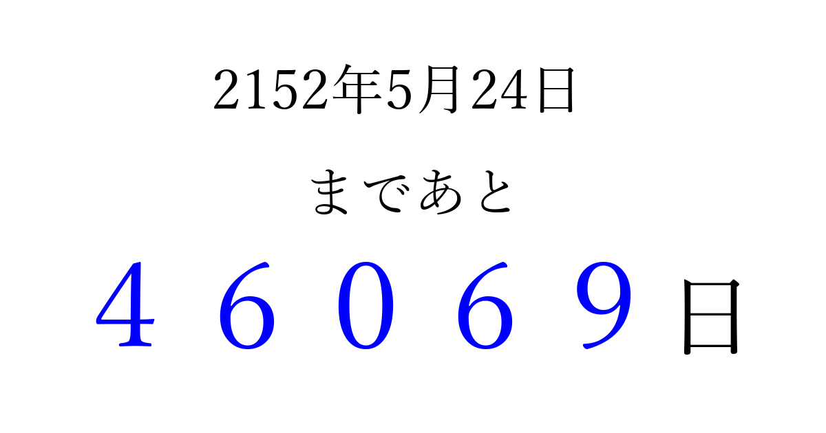 2152年5月24日(水)まで あと 99999 日です 追加すると、トップページからすぐ選べるようになります ※2026/04/06現在の結果です。 最新の状態に更新する ↓シェアして、タイムライン上にカウントダウンを表示しよう!↓ 📤 この結果を共有する Tweet シェア Threads Bluesky 別の日付でカウントダウン 2152年5月のカレンダー このページをブックマークに追加すると、いつでもカウントダウンを確認できます。 (PC: Ctrl+D / Mac: ⌘+D) hitome-notes.comでは以下のページも運営しています。 指定日と期間から日付を計算 | ガチャ確率計算・シミュレーション | プライバシー・ポリシー 運営者:Avocado