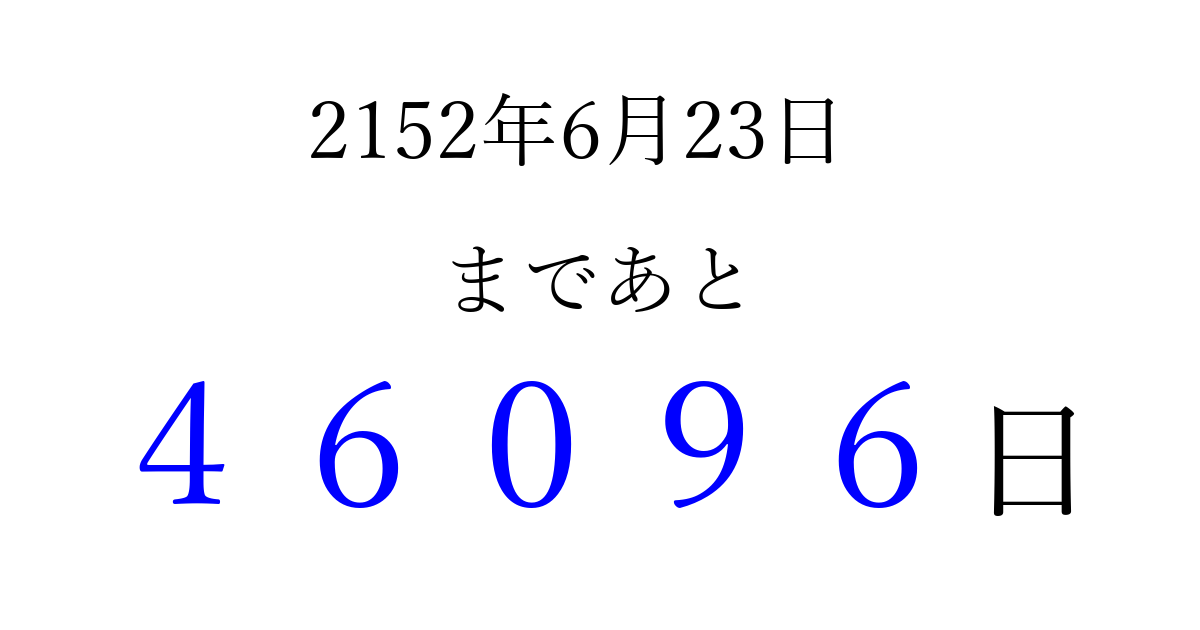 2152年6月23日(金)まで あと 99999 日です 追加すると、トップページからすぐ選べるようになります ※2026/04/09現在の結果です。 最新の状態に更新する ↓シェアして、タイムライン上にカウントダウンを表示しよう!↓ 📤 この結果を共有する Tweet シェア Threads Bluesky 別の日付でカウントダウン 2152年6月のカレンダー このページをブックマークに追加すると、いつでもカウントダウンを確認できます。 (PC: Ctrl+D / Mac: ⌘+D) hitome-notes.comでは以下のページも運営しています。 指定日と期間から日付を計算 | ガチャ確率計算・シミュレーション | プライバシー・ポリシー 運営者:Avocado