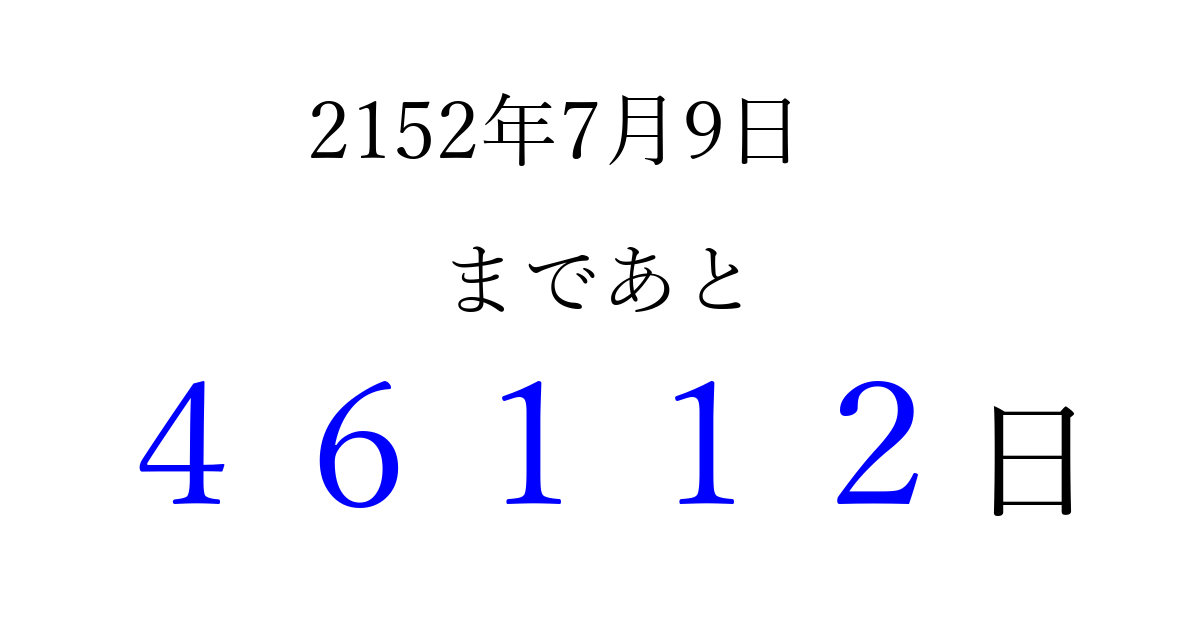 2152年7月9日(日)まで あと 99999 日です 追加すると、トップページからすぐ選べるようになります ※2026/04/09現在の結果です。 最新の状態に更新する ↓シェアして、タイムライン上にカウントダウンを表示しよう!↓ 📤 この結果を共有する Tweet シェア Threads Bluesky 別の日付でカウントダウン 2152年7月のカレンダー このページをブックマークに追加すると、いつでもカウントダウンを確認できます。 (PC: Ctrl+D / Mac: ⌘+D) hitome-notes.comでは以下のページも運営しています。 指定日と期間から日付を計算 | ガチャ確率計算・シミュレーション | プライバシー・ポリシー 運営者:Avocado