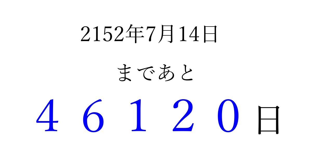2152年7月14日(金)まで あと 99999 日です 追加すると、トップページからすぐ選べるようになります ※2026/04/06現在の結果です。 最新の状態に更新する ↓シェアして、タイムライン上にカウントダウンを表示しよう!↓ 📤 この結果を共有する Tweet シェア Threads Bluesky 別の日付でカウントダウン 2152年7月のカレンダー このページをブックマークに追加すると、いつでもカウントダウンを確認できます。 (PC: Ctrl+D / Mac: ⌘+D) hitome-notes.comでは以下のページも運営しています。 指定日と期間から日付を計算 | ガチャ確率計算・シミュレーション | プライバシー・ポリシー 運営者:Avocado