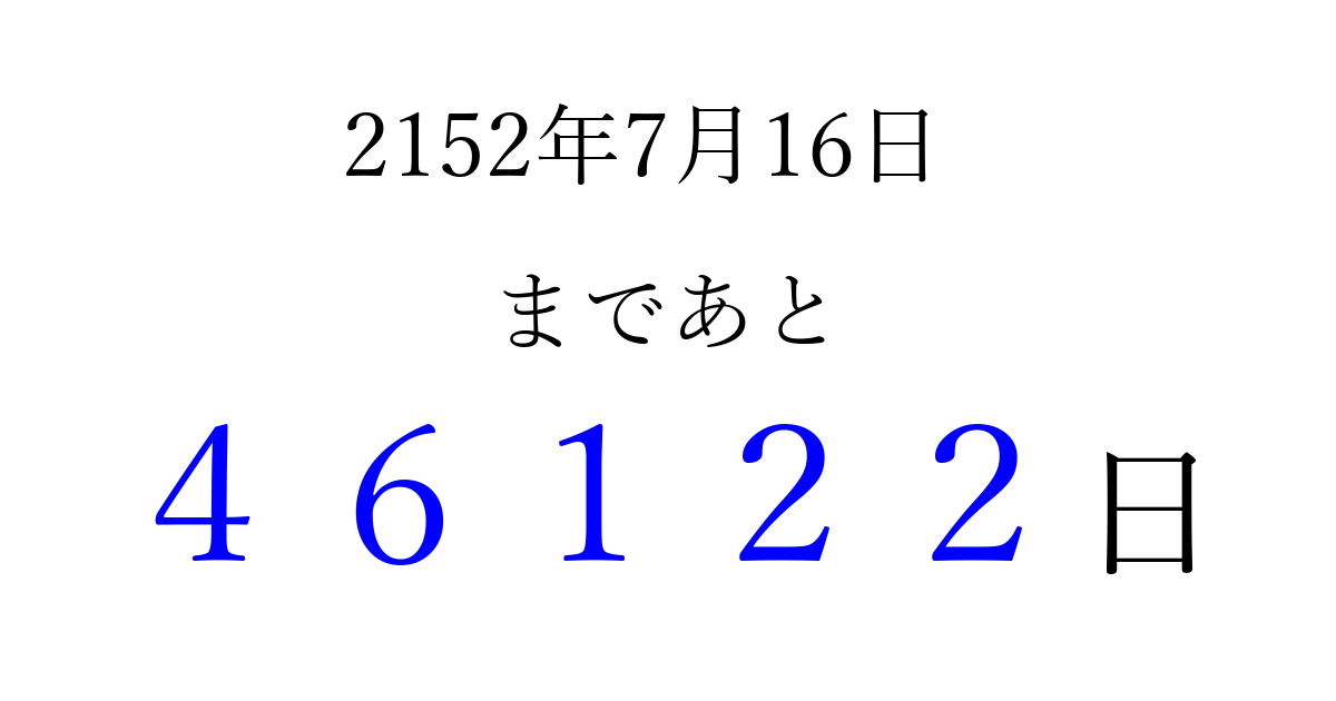 2152年7月16日(日)まで あと 99999 日です 追加すると、トップページからすぐ選べるようになります ※2026/04/06現在の結果です。 最新の状態に更新する ↓シェアして、タイムライン上にカウントダウンを表示しよう!↓ 📤 この結果を共有する Tweet シェア Threads Bluesky 別の日付でカウントダウン 2152年7月のカレンダー このページをブックマークに追加すると、いつでもカウントダウンを確認できます。 (PC: Ctrl+D / Mac: ⌘+D) hitome-notes.comでは以下のページも運営しています。 指定日と期間から日付を計算 | ガチャ確率計算・シミュレーション | プライバシー・ポリシー 運営者:Avocado