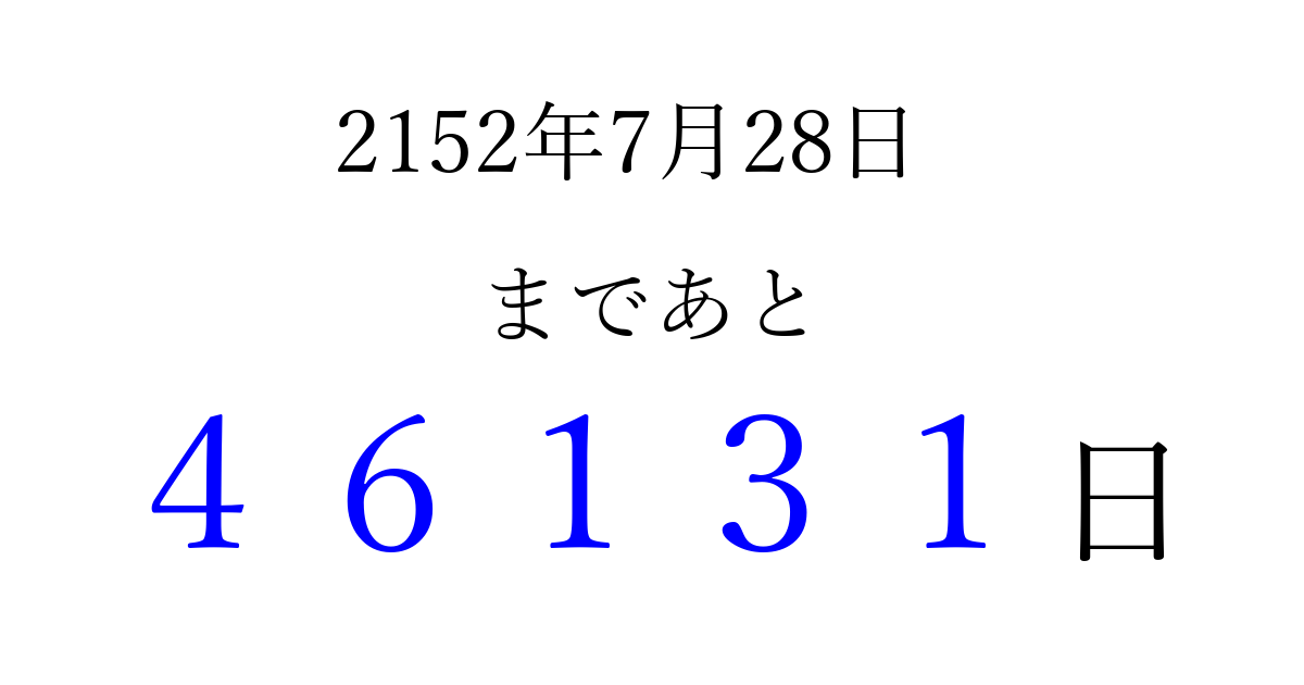 2152年7月28日(金)まで あと 99999 日です 追加すると、トップページからすぐ選べるようになります ※2026/04/09現在の結果です。 最新の状態に更新する ↓シェアして、タイムライン上にカウントダウンを表示しよう!↓ 📤 この結果を共有する Tweet シェア Threads Bluesky 別の日付でカウントダウン 2152年7月のカレンダー このページをブックマークに追加すると、いつでもカウントダウンを確認できます。 (PC: Ctrl+D / Mac: ⌘+D) hitome-notes.comでは以下のページも運営しています。 指定日と期間から日付を計算 | ガチャ確率計算・シミュレーション | プライバシー・ポリシー 運営者:Avocado