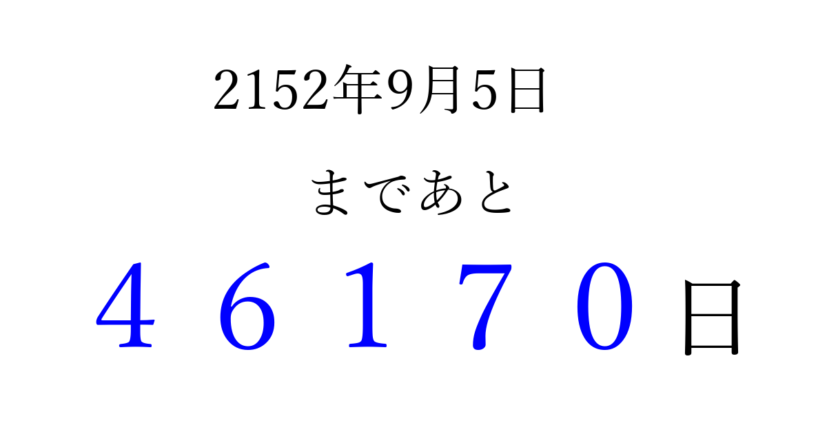2152年9月5日(火)まで あと 99999 日です 追加すると、トップページからすぐ選べるようになります ※2026/04/09現在の結果です。 最新の状態に更新する ↓シェアして、タイムライン上にカウントダウンを表示しよう!↓ 📤 この結果を共有する Tweet シェア Threads Bluesky 別の日付でカウントダウン 2152年9月のカレンダー このページをブックマークに追加すると、いつでもカウントダウンを確認できます。 (PC: Ctrl+D / Mac: ⌘+D) hitome-notes.comでは以下のページも運営しています。 指定日と期間から日付を計算 | ガチャ確率計算・シミュレーション | プライバシー・ポリシー 運営者:Avocado
