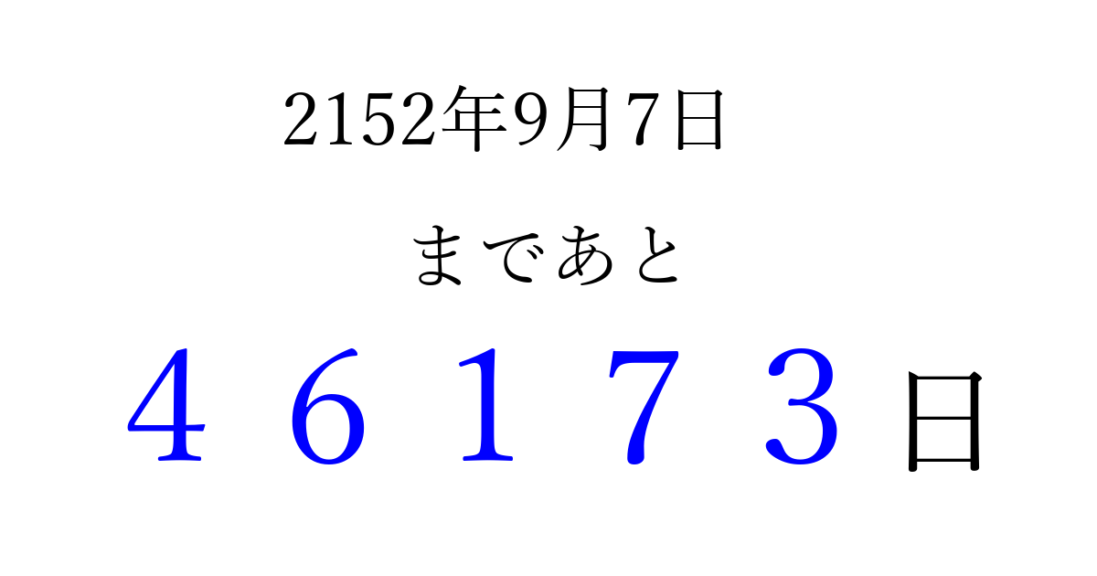 2152年9月7日(木)まで あと 99999 日です 追加すると、トップページからすぐ選べるようになります ※2026/04/08現在の結果です。 最新の状態に更新する ↓シェアして、タイムライン上にカウントダウンを表示しよう!↓ 📤 この結果を共有する Tweet シェア Threads Bluesky 別の日付でカウントダウン 2152年9月のカレンダー このページをブックマークに追加すると、いつでもカウントダウンを確認できます。 (PC: Ctrl+D / Mac: ⌘+D) hitome-notes.comでは以下のページも運営しています。 指定日と期間から日付を計算 | ガチャ確率計算・シミュレーション | プライバシー・ポリシー 運営者:Avocado