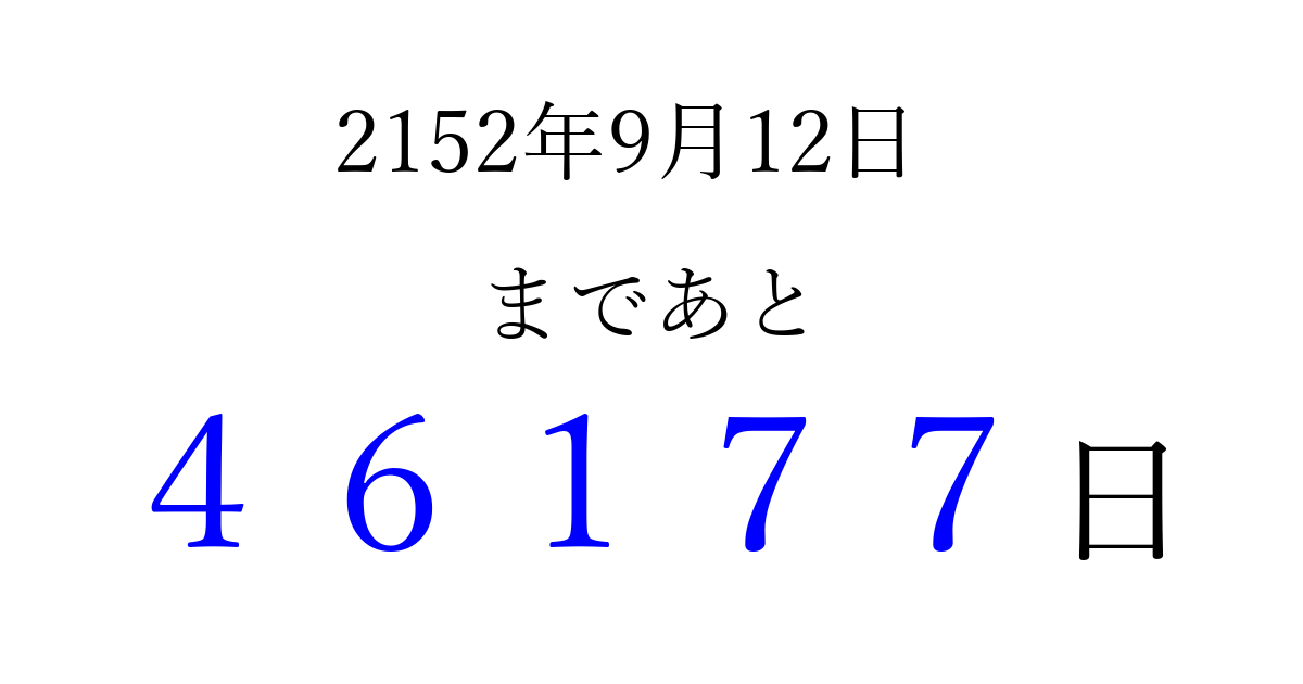 2152年9月12日(火)まで あと 99999 日です 追加すると、トップページからすぐ選べるようになります ※2026/04/09現在の結果です。 最新の状態に更新する ↓シェアして、タイムライン上にカウントダウンを表示しよう!↓ 📤 この結果を共有する Tweet シェア Threads Bluesky 別の日付でカウントダウン 2152年9月のカレンダー このページをブックマークに追加すると、いつでもカウントダウンを確認できます。 (PC: Ctrl+D / Mac: ⌘+D) hitome-notes.comでは以下のページも運営しています。 指定日と期間から日付を計算 | ガチャ確率計算・シミュレーション | プライバシー・ポリシー 運営者:Avocado