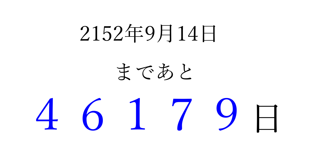 2152年9月14日(木)まで あと 99999 日です 追加すると、トップページからすぐ選べるようになります ※2026/04/09現在の結果です。 最新の状態に更新する ↓シェアして、タイムライン上にカウントダウンを表示しよう!↓ 📤 この結果を共有する Tweet シェア Threads Bluesky 別の日付でカウントダウン 2152年9月のカレンダー このページをブックマークに追加すると、いつでもカウントダウンを確認できます。 (PC: Ctrl+D / Mac: ⌘+D) hitome-notes.comでは以下のページも運営しています。 指定日と期間から日付を計算 | ガチャ確率計算・シミュレーション | プライバシー・ポリシー 運営者:Avocado