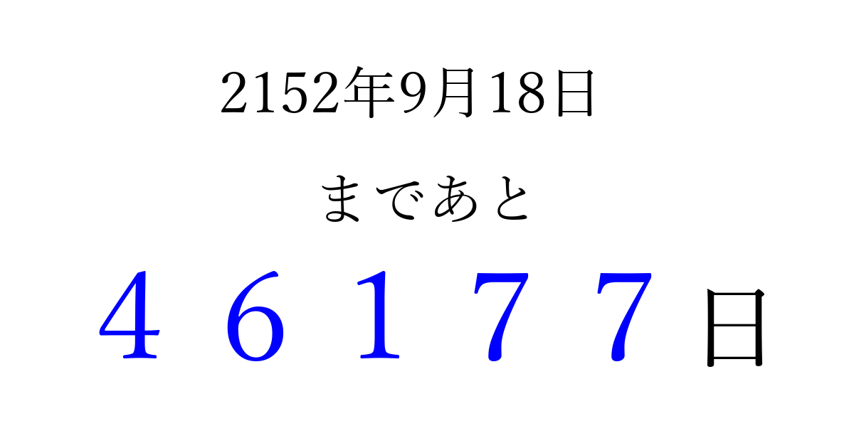 2152年9月18日(月)まで あと 99999 日です 追加すると、トップページからすぐ選べるようになります ※2026/04/15現在の結果です。 最新の状態に更新する ↓シェアして、タイムライン上にカウントダウンを表示しよう!↓ 📤 この結果を共有する Tweet シェア Threads Bluesky 別の日付でカウントダウン 2152年9月のカレンダー このページをブックマークに追加すると、いつでもカウントダウンを確認できます。 (PC: Ctrl+D / Mac: ⌘+D) hitome-notes.comでは以下のページも運営しています。 指定日と期間から日付を計算 | ガチャ確率計算・シミュレーション | プライバシー・ポリシー 運営者:Avocado
