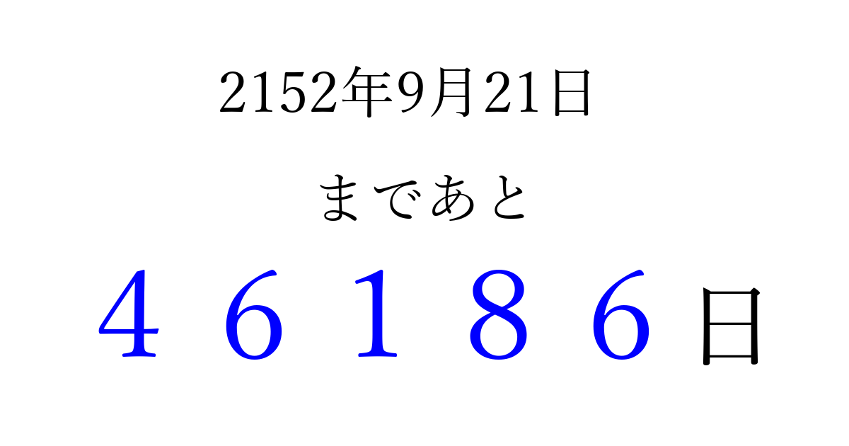 2152年9月21日(木)まで あと 99999 日です 追加すると、トップページからすぐ選べるようになります ※2026/04/09現在の結果です。 最新の状態に更新する ↓シェアして、タイムライン上にカウントダウンを表示しよう!↓ 📤 この結果を共有する Tweet シェア Threads Bluesky 別の日付でカウントダウン 2152年9月のカレンダー このページをブックマークに追加すると、いつでもカウントダウンを確認できます。 (PC: Ctrl+D / Mac: ⌘+D) hitome-notes.comでは以下のページも運営しています。 指定日と期間から日付を計算 | ガチャ確率計算・シミュレーション | プライバシー・ポリシー 運営者:Avocado