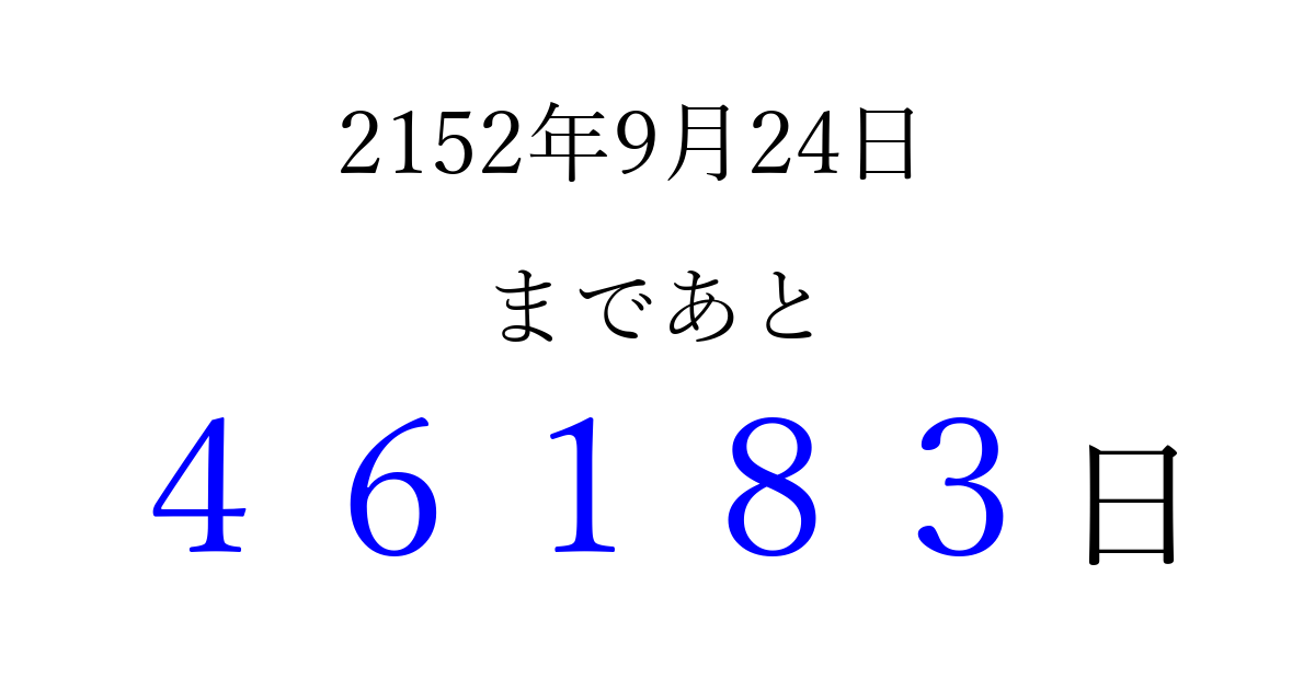 2152年9月24日(日)まで あと 99999 日です 追加すると、トップページからすぐ選べるようになります ※2026/04/15現在の結果です。 最新の状態に更新する ↓シェアして、タイムライン上にカウントダウンを表示しよう!↓ 📤 この結果を共有する Tweet シェア Threads Bluesky 別の日付でカウントダウン 2152年9月のカレンダー このページをブックマークに追加すると、いつでもカウントダウンを確認できます。 (PC: Ctrl+D / Mac: ⌘+D) hitome-notes.comでは以下のページも運営しています。 指定日と期間から日付を計算 | ガチャ確率計算・シミュレーション | プライバシー・ポリシー 運営者:Avocado