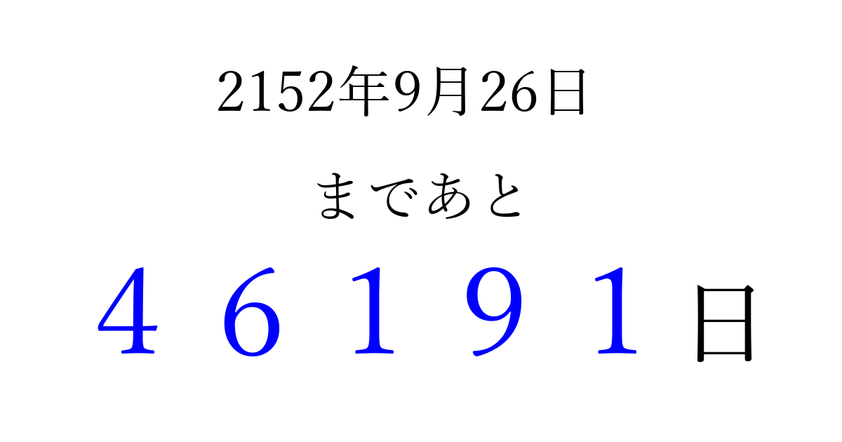 2152年9月26日(火)まで あと 99999 日です 追加すると、トップページからすぐ選べるようになります ※2026/04/09現在の結果です。 最新の状態に更新する ↓シェアして、タイムライン上にカウントダウンを表示しよう!↓ 📤 この結果を共有する Tweet シェア Threads Bluesky 別の日付でカウントダウン 2152年9月のカレンダー このページをブックマークに追加すると、いつでもカウントダウンを確認できます。 (PC: Ctrl+D / Mac: ⌘+D) hitome-notes.comでは以下のページも運営しています。 指定日と期間から日付を計算 | ガチャ確率計算・シミュレーション | プライバシー・ポリシー 運営者:Avocado