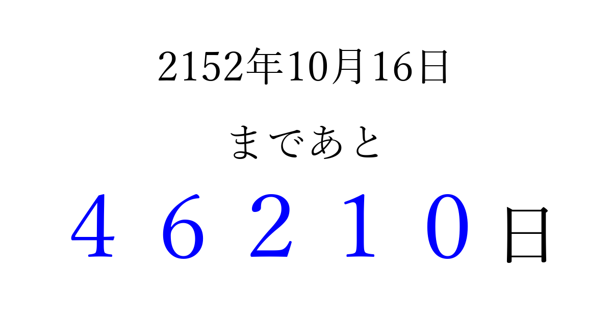 2152年10月16日(月)まで あと 99999 日です 追加すると、トップページからすぐ選べるようになります ※2026/04/10現在の結果です。 最新の状態に更新する ↓シェアして、タイムライン上にカウントダウンを表示しよう!↓ 📤 この結果を共有する Tweet シェア Threads Bluesky 別の日付でカウントダウン 2152年10月のカレンダー このページをブックマークに追加すると、いつでもカウントダウンを確認できます。 (PC: Ctrl+D / Mac: ⌘+D) hitome-notes.comでは以下のページも運営しています。 指定日と期間から日付を計算 | ガチャ確率計算・シミュレーション | プライバシー・ポリシー 運営者:Avocado