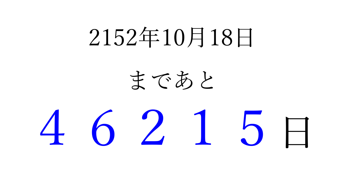 2152年10月18日(水)まで あと 99999 日です 追加すると、トップページからすぐ選べるようになります ※2026/04/07現在の結果です。 最新の状態に更新する ↓シェアして、タイムライン上にカウントダウンを表示しよう!↓ 📤 この結果を共有する Tweet シェア Threads Bluesky 別の日付でカウントダウン 2152年10月のカレンダー このページをブックマークに追加すると、いつでもカウントダウンを確認できます。 (PC: Ctrl+D / Mac: ⌘+D) hitome-notes.comでは以下のページも運営しています。 指定日と期間から日付を計算 | ガチャ確率計算・シミュレーション | プライバシー・ポリシー 運営者:Avocado