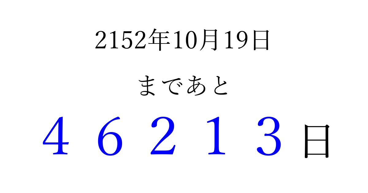 2152年10月19日(木)まで あと 99999 日です 追加すると、トップページからすぐ選べるようになります ※2026/04/10現在の結果です。 最新の状態に更新する ↓シェアして、タイムライン上にカウントダウンを表示しよう!↓ 📤 この結果を共有する Tweet シェア Threads Bluesky 別の日付でカウントダウン 2152年10月のカレンダー このページをブックマークに追加すると、いつでもカウントダウンを確認できます。 (PC: Ctrl+D / Mac: ⌘+D) hitome-notes.comでは以下のページも運営しています。 指定日と期間から日付を計算 | ガチャ確率計算・シミュレーション | プライバシー・ポリシー 運営者:Avocado