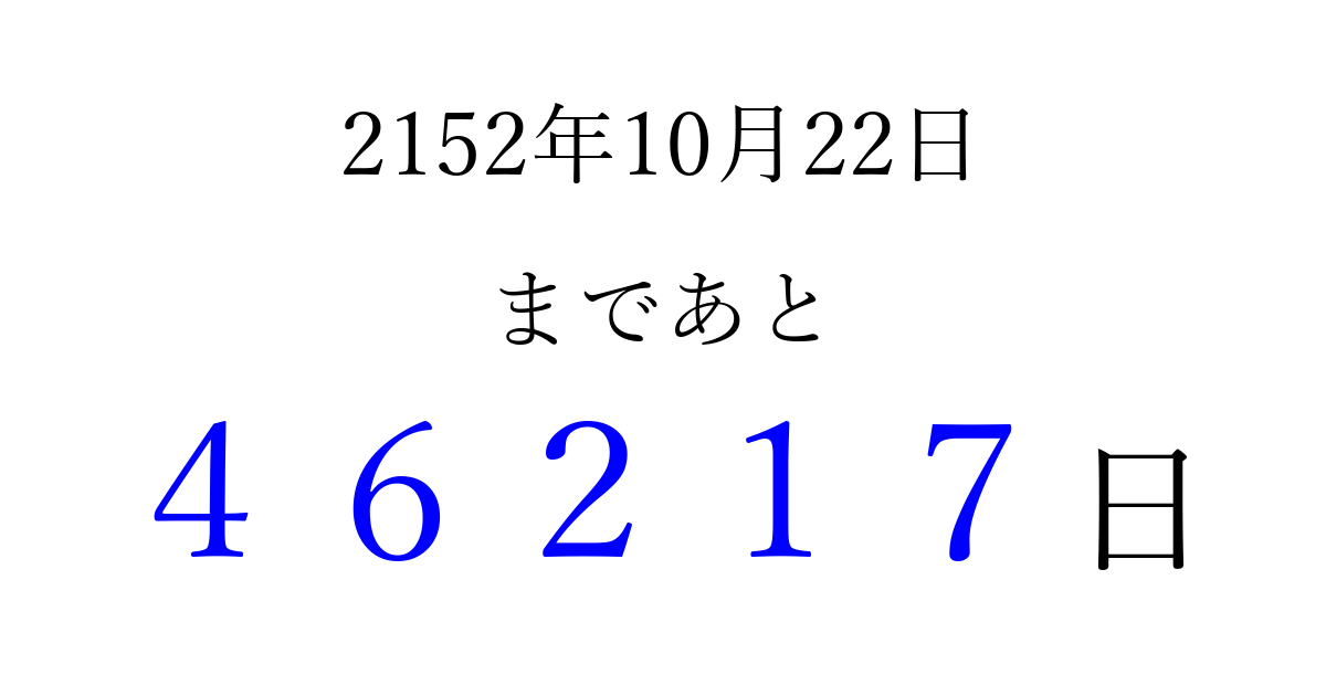 2152年10月22日(日)まで あと 99999 日です 追加すると、トップページからすぐ選べるようになります ※2026/04/09現在の結果です。 最新の状態に更新する ↓シェアして、タイムライン上にカウントダウンを表示しよう!↓ 📤 この結果を共有する Tweet シェア Threads Bluesky 別の日付でカウントダウン 2152年10月のカレンダー このページをブックマークに追加すると、いつでもカウントダウンを確認できます。 (PC: Ctrl+D / Mac: ⌘+D) hitome-notes.comでは以下のページも運営しています。 指定日と期間から日付を計算 | ガチャ確率計算・シミュレーション | プライバシー・ポリシー 運営者:Avocado