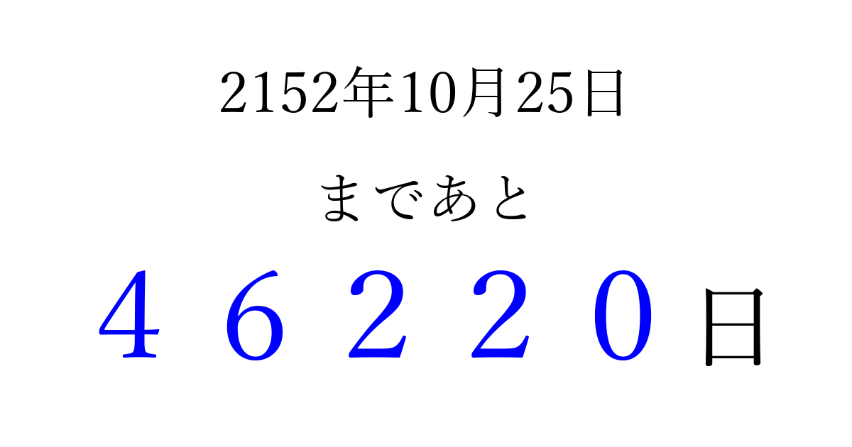 2152年10月25日(水)まで あと 99999 日です 追加すると、トップページからすぐ選べるようになります ※2026/04/09現在の結果です。 最新の状態に更新する ↓シェアして、タイムライン上にカウントダウンを表示しよう!↓ 📤 この結果を共有する Tweet シェア Threads Bluesky 別の日付でカウントダウン 2152年10月のカレンダー このページをブックマークに追加すると、いつでもカウントダウンを確認できます。 (PC: Ctrl+D / Mac: ⌘+D) hitome-notes.comでは以下のページも運営しています。 指定日と期間から日付を計算 | ガチャ確率計算・シミュレーション | プライバシー・ポリシー 運営者:Avocado