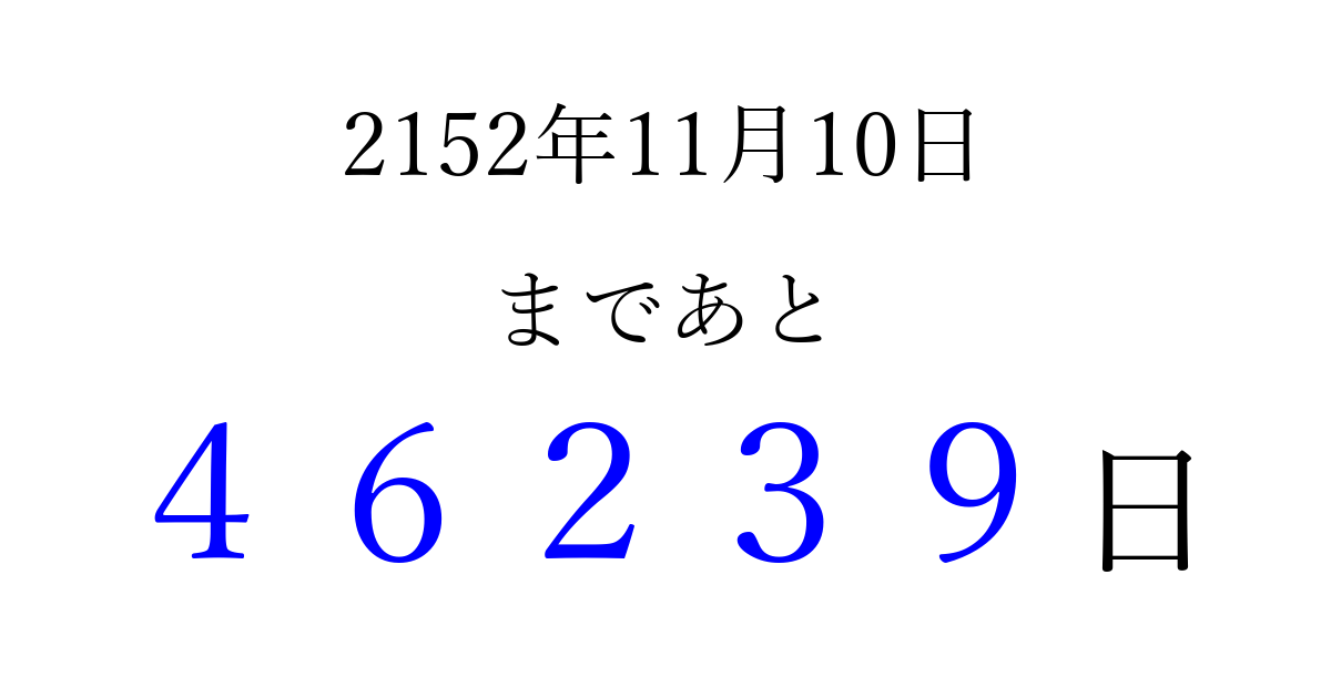 2152年11月10日(金)まで あと 99999 日です 追加すると、トップページからすぐ選べるようになります ※2026/04/06現在の結果です。 最新の状態に更新する ↓シェアして、タイムライン上にカウントダウンを表示しよう!↓ 📤 この結果を共有する Tweet シェア Threads Bluesky 別の日付でカウントダウン 2152年11月のカレンダー このページをブックマークに追加すると、いつでもカウントダウンを確認できます。 (PC: Ctrl+D / Mac: ⌘+D) hitome-notes.comでは以下のページも運営しています。 指定日と期間から日付を計算 | ガチャ確率計算・シミュレーション | プライバシー・ポリシー 運営者:Avocado