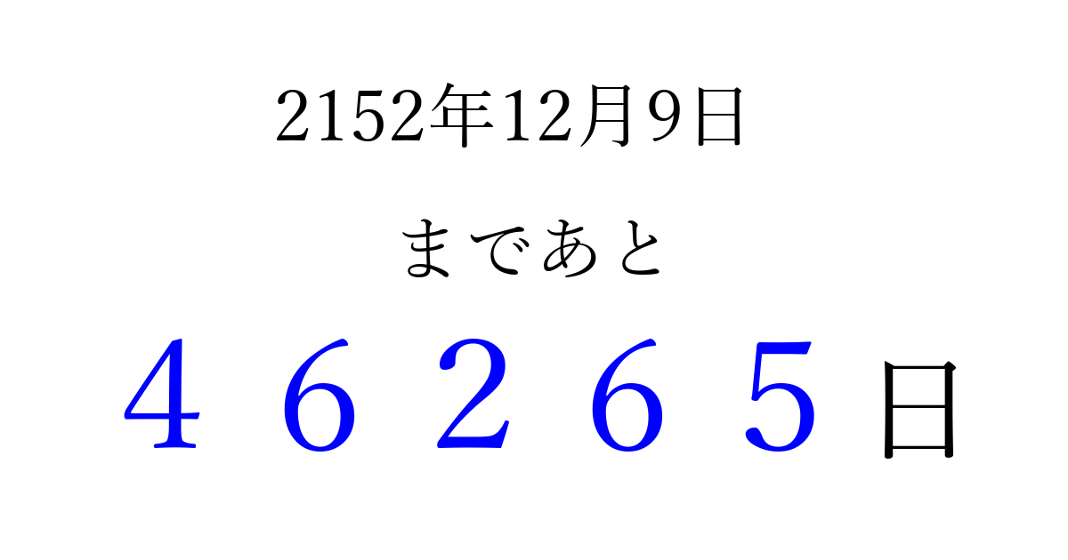 2152年12月9日(土)まで あと 99999 日です 追加すると、トップページからすぐ選べるようになります ※2026/04/09現在の結果です。 最新の状態に更新する ↓シェアして、タイムライン上にカウントダウンを表示しよう!↓ 📤 この結果を共有する Tweet シェア Threads Bluesky 別の日付でカウントダウン 2152年12月のカレンダー このページをブックマークに追加すると、いつでもカウントダウンを確認できます。 (PC: Ctrl+D / Mac: ⌘+D) hitome-notes.comでは以下のページも運営しています。 指定日と期間から日付を計算 | ガチャ確率計算・シミュレーション | プライバシー・ポリシー 運営者:Avocado