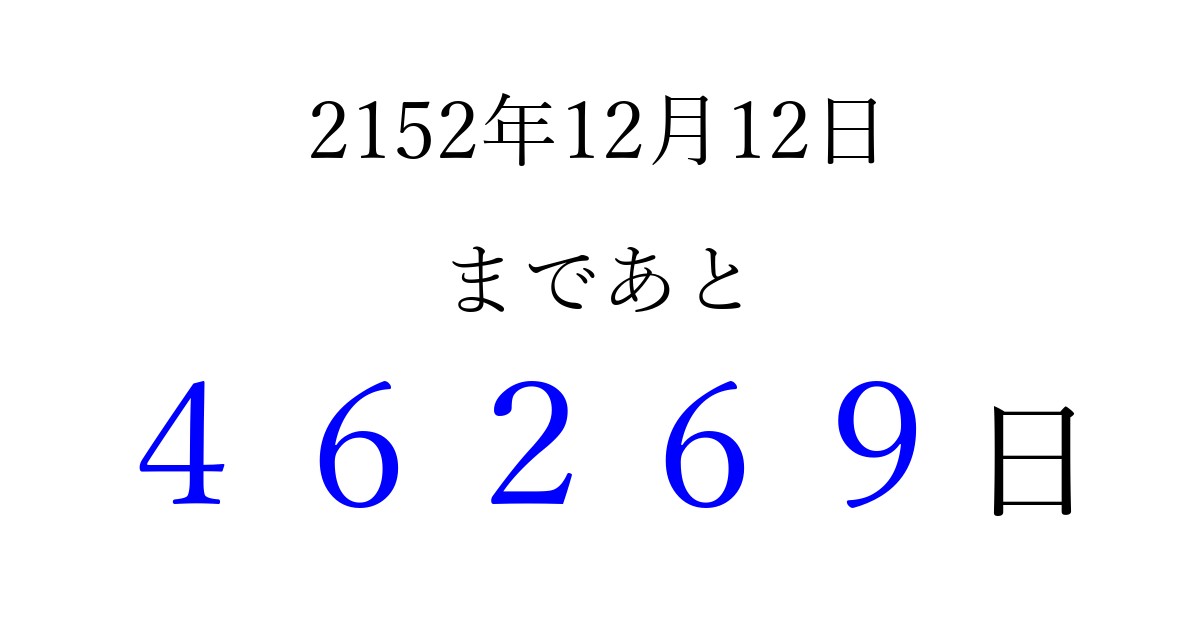 2152年12月12日(火)まで あと 99999 日です 追加すると、トップページからすぐ選べるようになります ※2026/04/08現在の結果です。 最新の状態に更新する ↓シェアして、タイムライン上にカウントダウンを表示しよう!↓ 📤 この結果を共有する Tweet シェア Threads Bluesky 別の日付でカウントダウン 2152年12月のカレンダー このページをブックマークに追加すると、いつでもカウントダウンを確認できます。 (PC: Ctrl+D / Mac: ⌘+D) hitome-notes.comでは以下のページも運営しています。 指定日と期間から日付を計算 | ガチャ確率計算・シミュレーション | プライバシー・ポリシー 運営者:Avocado